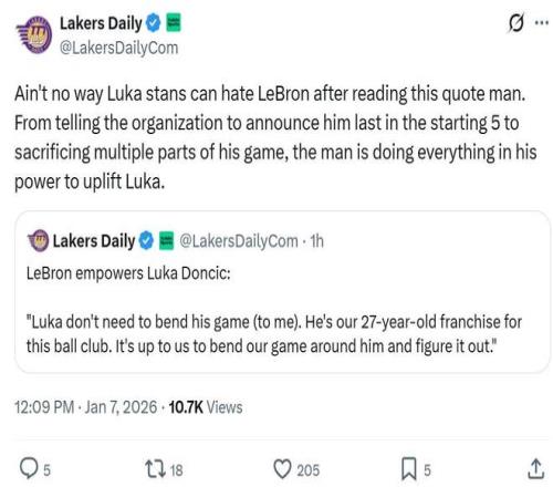 湖人媒体Lakers Daily坦言:“东契奇球迷听到这一番话后,不可能再讨厌詹姆斯了,从球队介绍首发五虎时将东契奇放在最后,到牺牲各方面适应东契奇,勒布朗竭尽全力来提升卢卡的地位。”